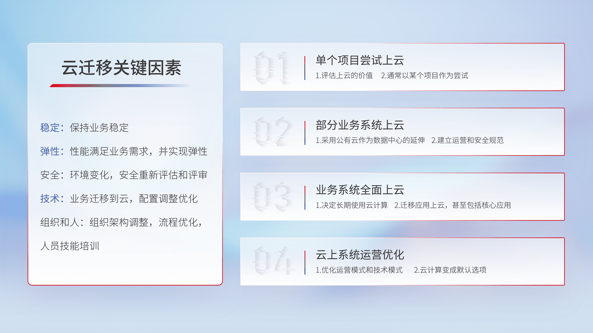结合实际业务,,从规划设计、、、云平台选型、、、、云原生改造、、、、数据迁移、、、、集成交付,,迁移全过程为客户识别最佳上云路径,,,做好风险识别管理,,,,设计网络架构、、、、身份权限、、、安全审计合规、、、、操作审计、、日志审计、、、、监控告警策略、、多站点容灾设计等,,,对云上基础设施进行整体规划,,提升IT治理水平,,,以满足弹性、、高可用、、高性能的需求。。