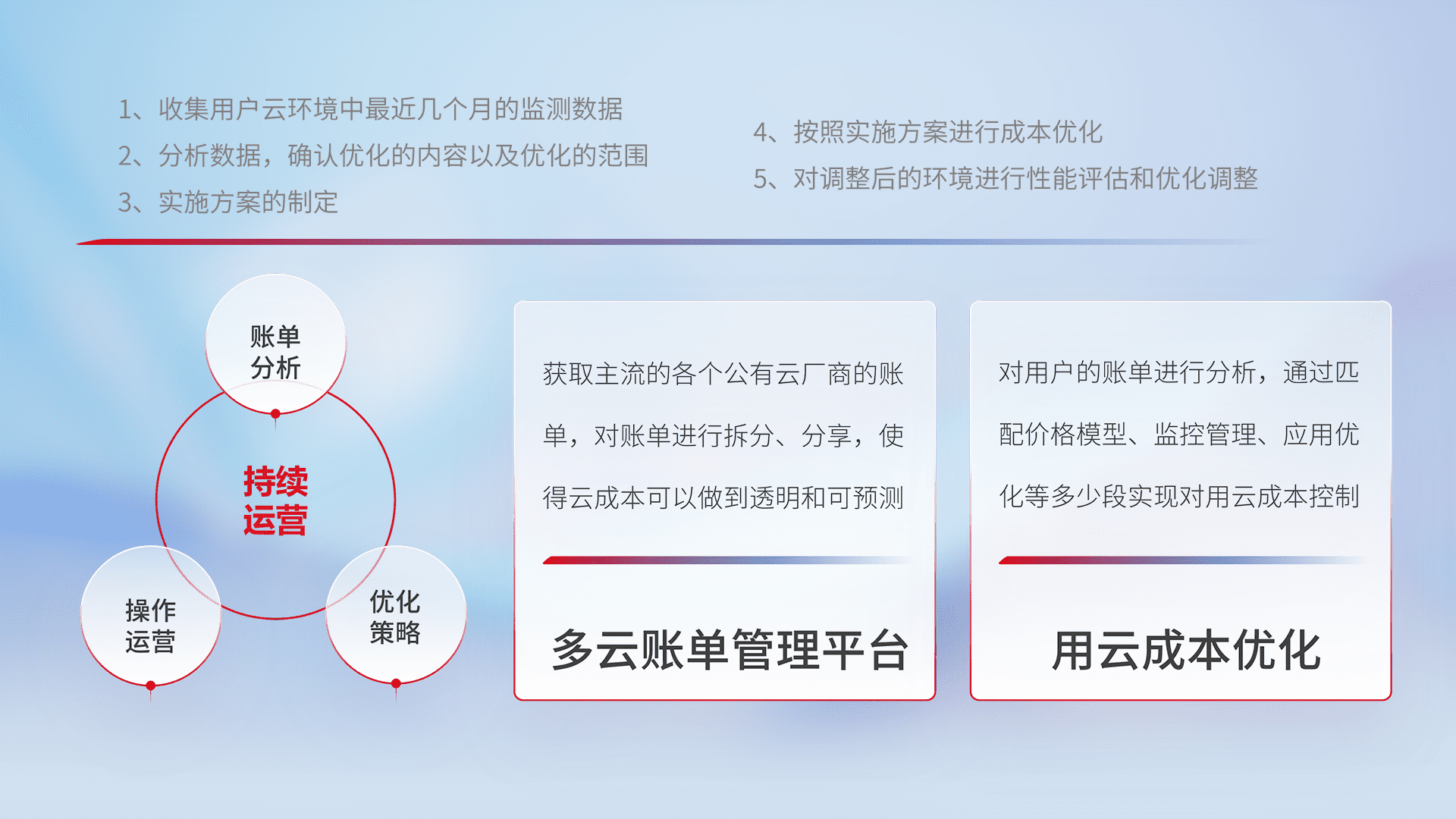 通过多云纳管,,,,以统一的资源数据模型把客户的云资源进行抽象和封装,,,,进而实现对多云资源的统一操作,,保障云资源管理的可靠性、、稳定性与可用性。。。。量身定制化运维内容,,配置、、、、开发运维、、补丁管理、、、、备份、、、监控、、、认证和访问管理、、、、审计和日常巡检等,,,,保障在用云过程中的可靠度,,稳定度以及高可用率。。